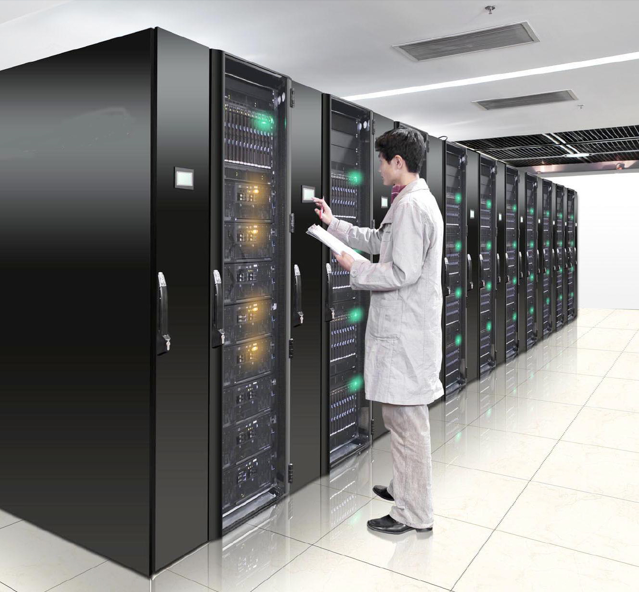 數(shù)據(jù)中心機(jī)房面積15000m2,主機(jī)房樓面載荷承重不低于800kg/m2,抗震不低于乙級(jí)8度,數(shù)據(jù)中心機(jī)房提供鋼制標(biāo)準(zhǔn)機(jī)架(機(jī)架寬度19英寸,高度2米或2.4米)。機(jī)房7x24小時(shí)專(zhuān)業(yè)安保服務(wù),數(shù)據(jù)中心機(jī)房由多臺(tái)艾默生精密空調(diào)采用側(cè)送和風(fēng)管輸送相結(jié)合的方式送風(fēng),使室內(nèi)溫濕度均衡分布,以保持恒溫恒濕環(huán)境。機(jī)房溫度:18~26攝氏度,相對(duì)濕度:40%~60%。